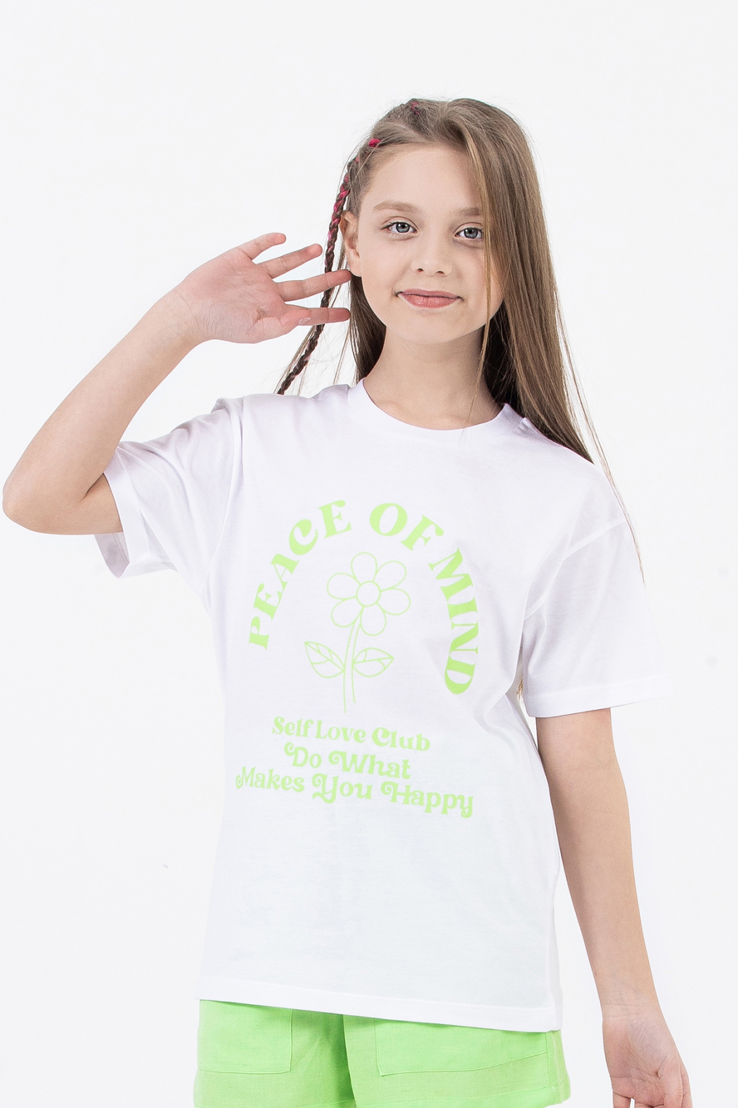 Футболка для девочки ДМБ  прямого кроя с округлой горловиной.  Благодаря цветочному принту футболка выглядит нарядно,оригинально по девчачьи мило и кокетливо. Футболка прекрасно сочетается с джинсами, юбками и шортами.