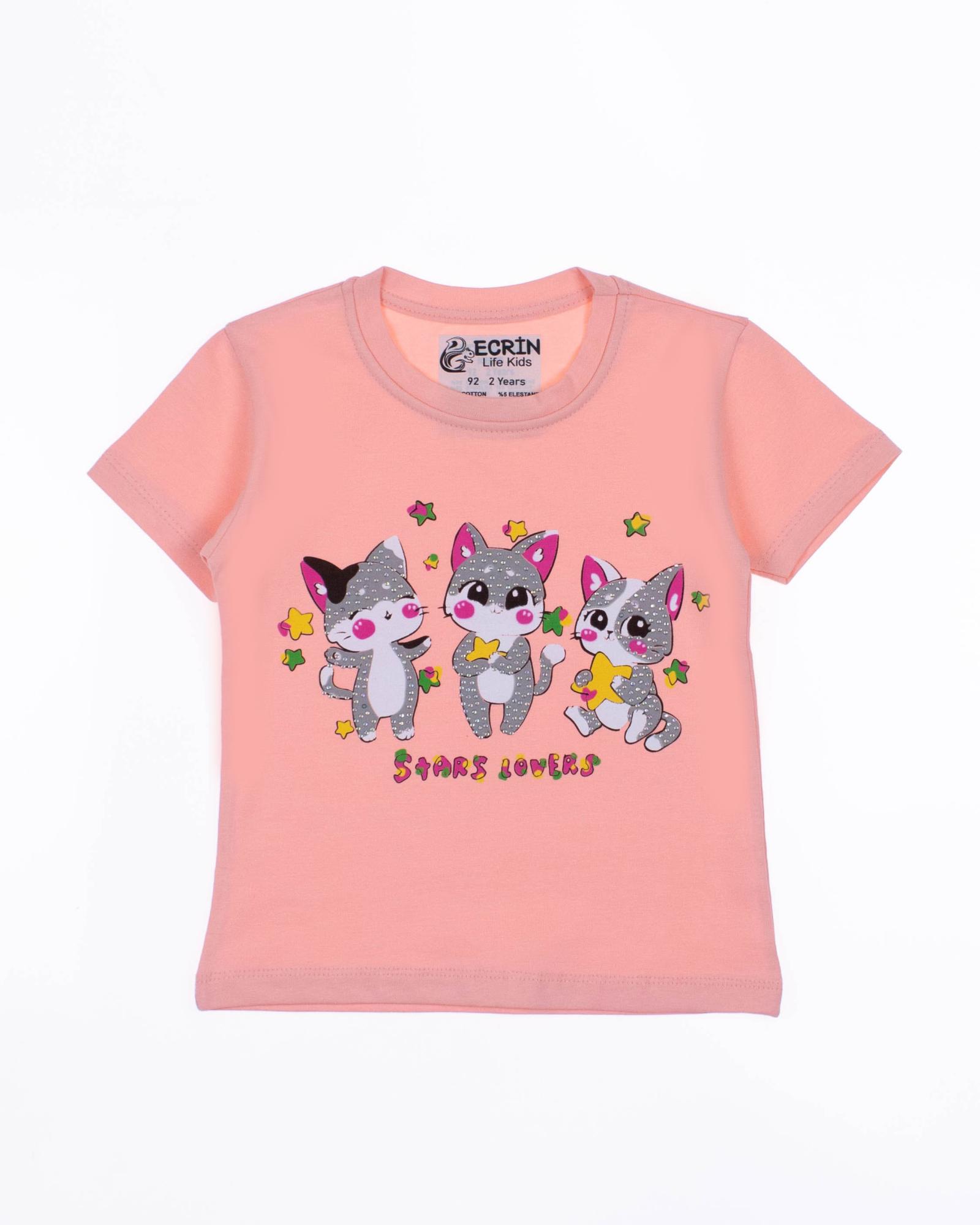 Футболка ECRIN для девочки оптом, производства Турция. Модель приталенного силуэта с короткими рукавами, милый принт украшен стразами.