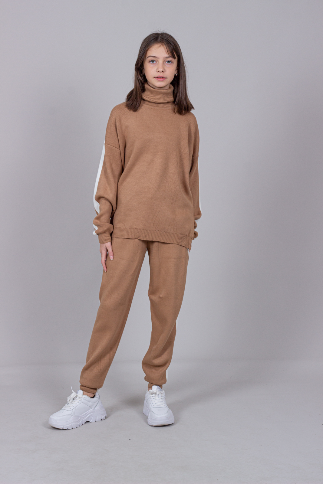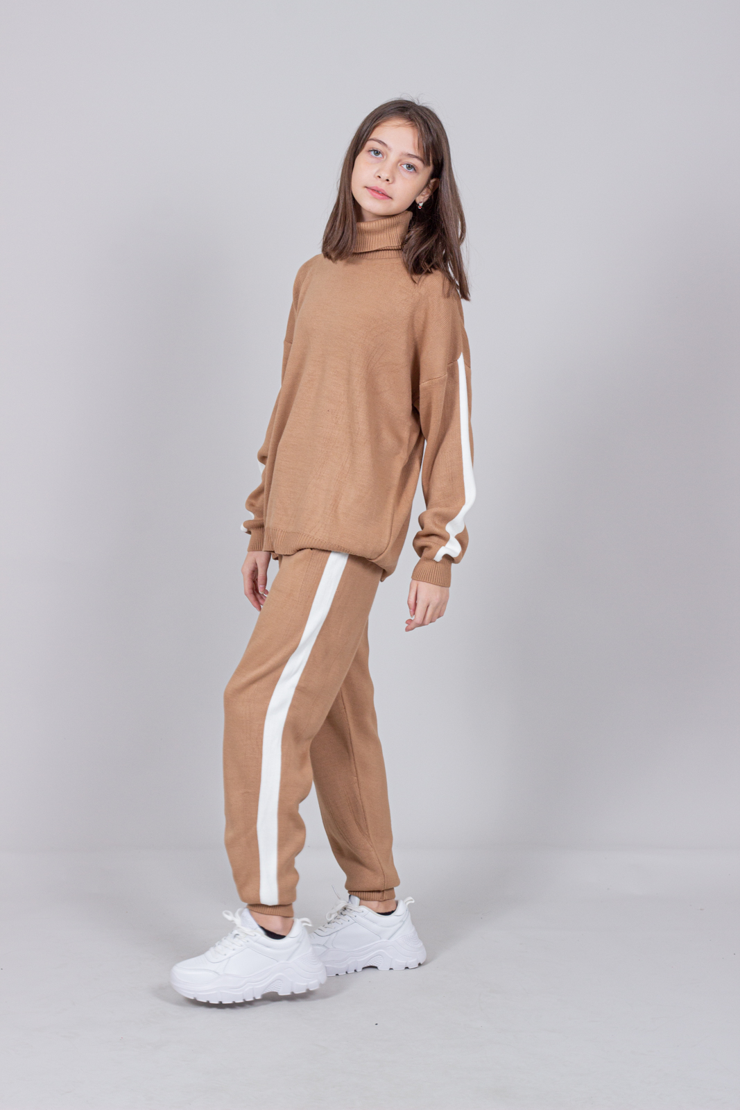 Трикотажный костюм для повседневной жизни выполнен из качественной турецкой пряжи. Костюм смотрится элегантно и стильно, отлично подходит для дома и отдыха.