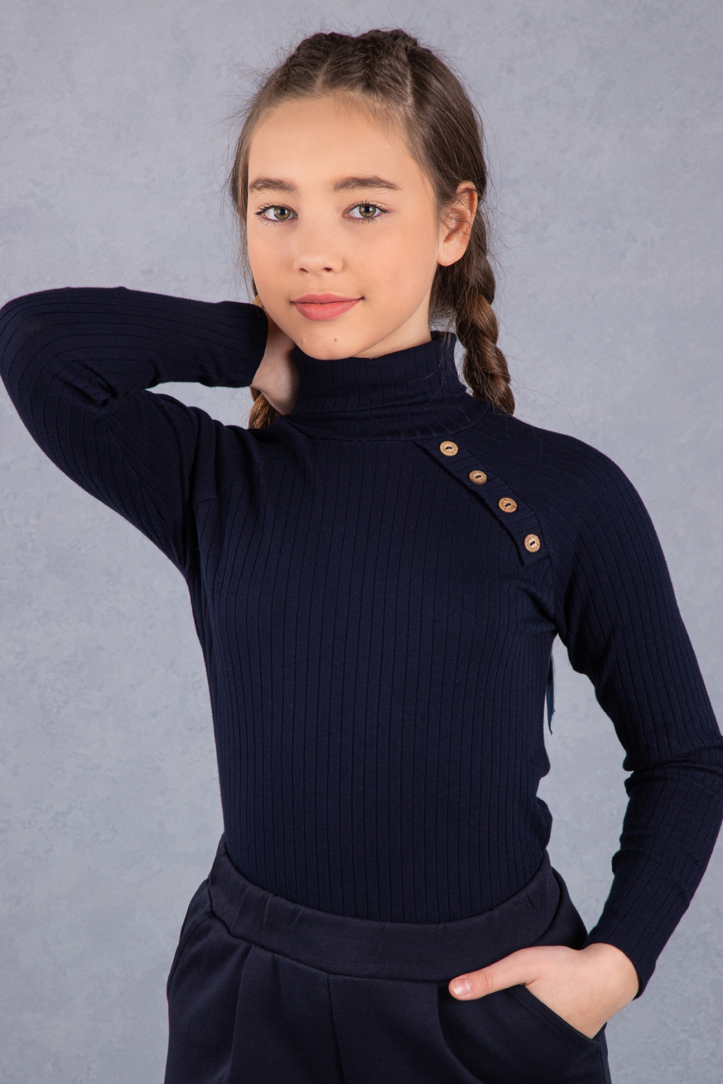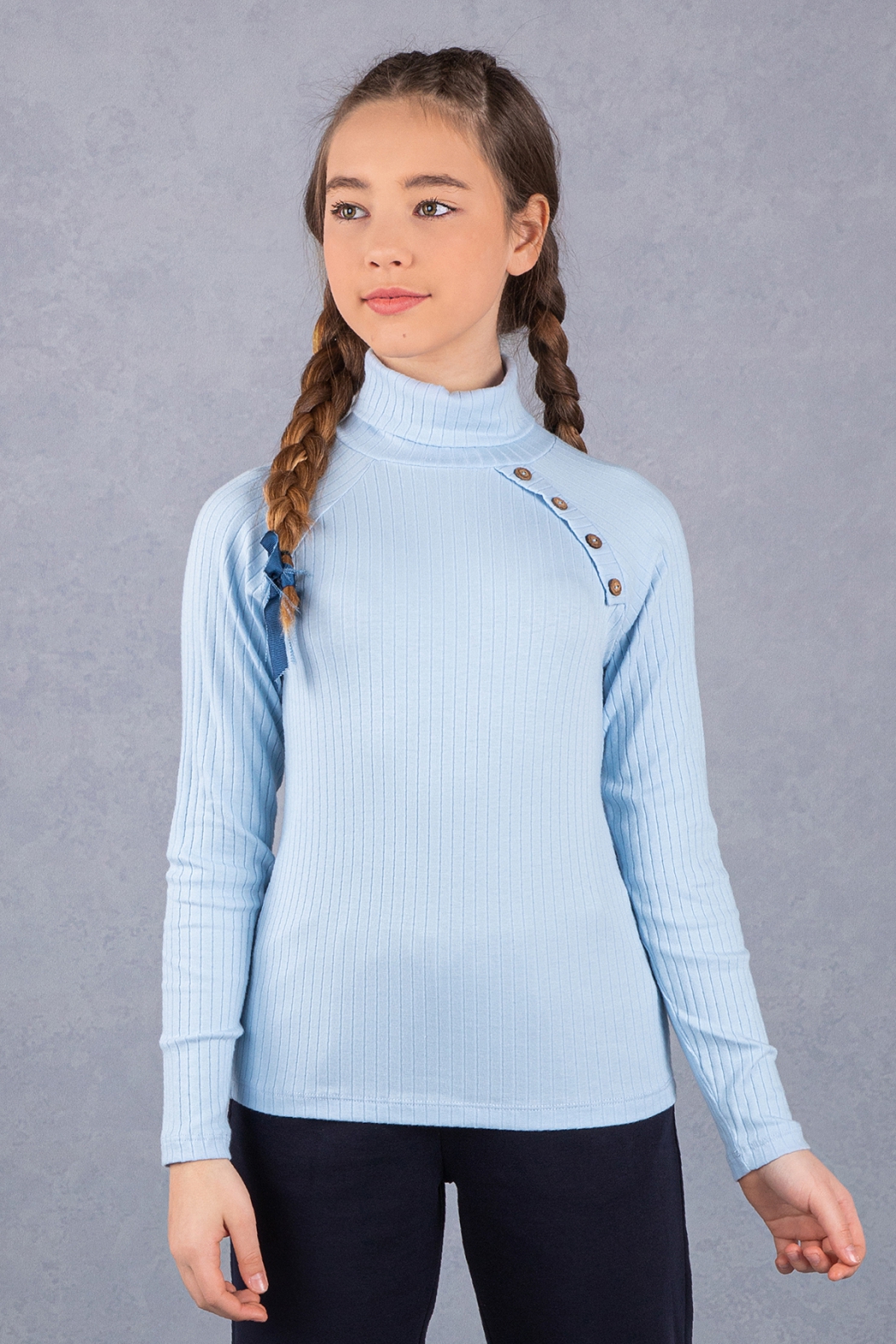 Школьная водолазка из мягкого трикотажа "лапша" для девочек. Модель очень приятная на ощупь и комфортная в носке. Приталенный фасон, воротник-стойка и длинные рукава. Изделие украшено декоративными пуговицами.