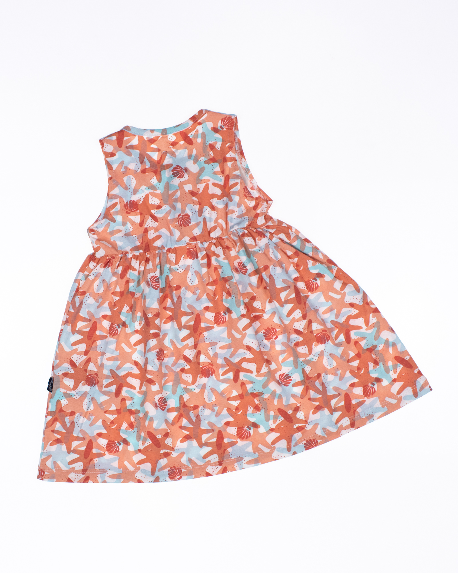Летнее платье для девочки выполнено из эластичного хлопкового трикотажа. Платье с короткими рукавами, расклешенное снизу, с принтом. Длина изделия выше колена.
