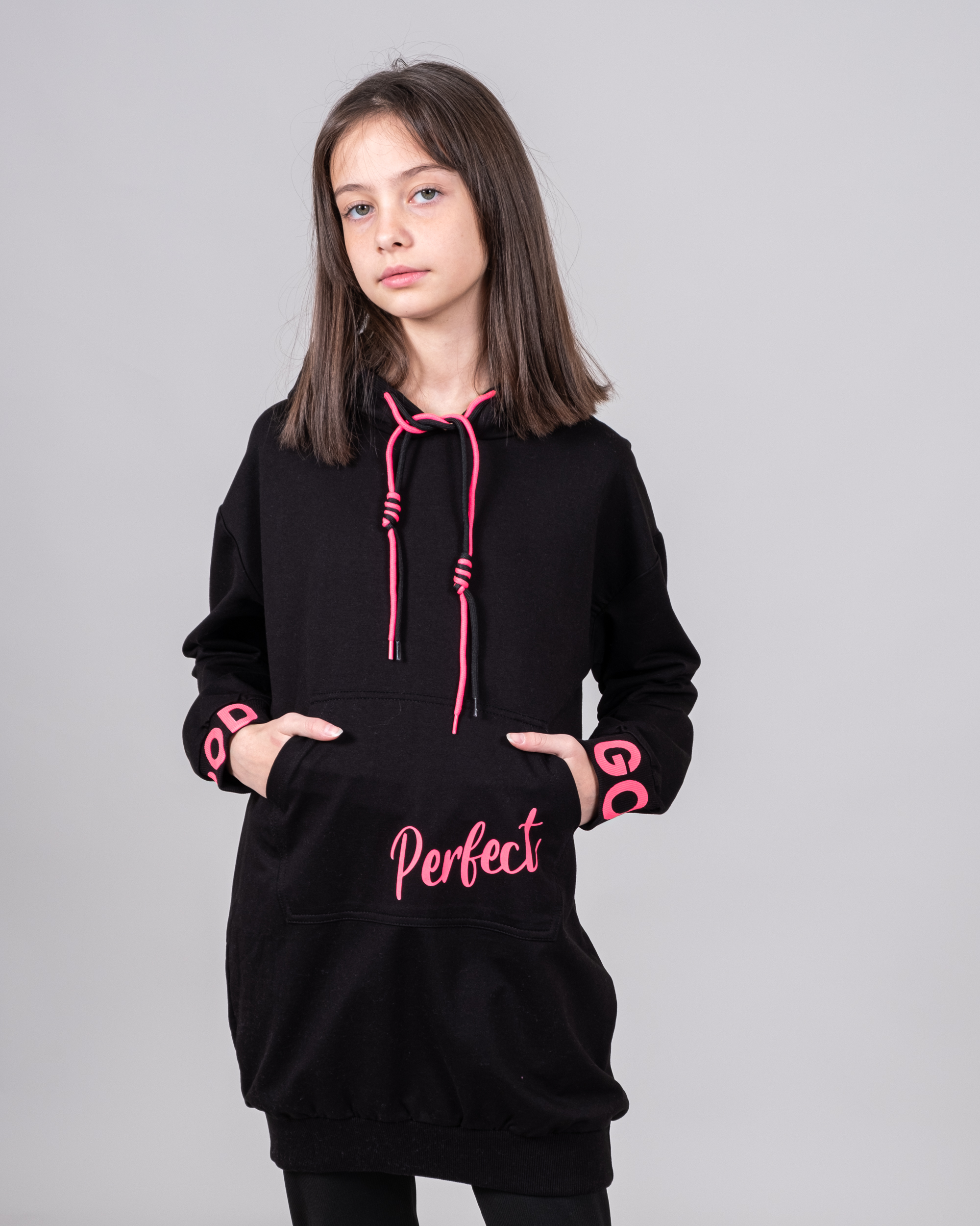 Худи Cegisa для девочки оптом выполнено из качественного трикотажа футер (петля). Модель декорирована яркими шнурками и принтом.