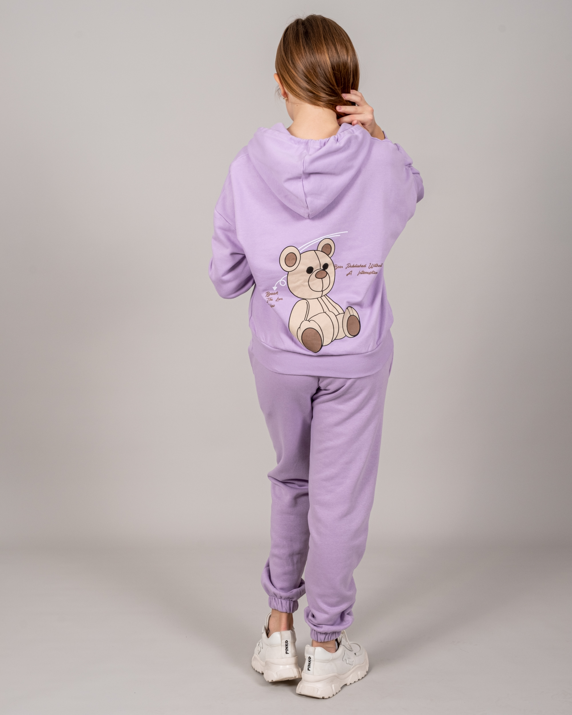 Худи для девочки выполнено из трикотажа - футер (петля). Модель дополнена аппликацией  в виде игрушечного медведя.