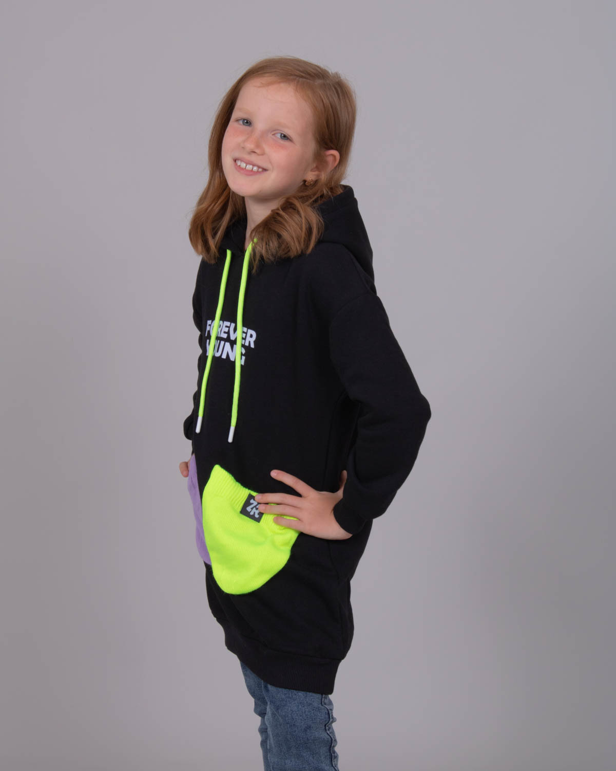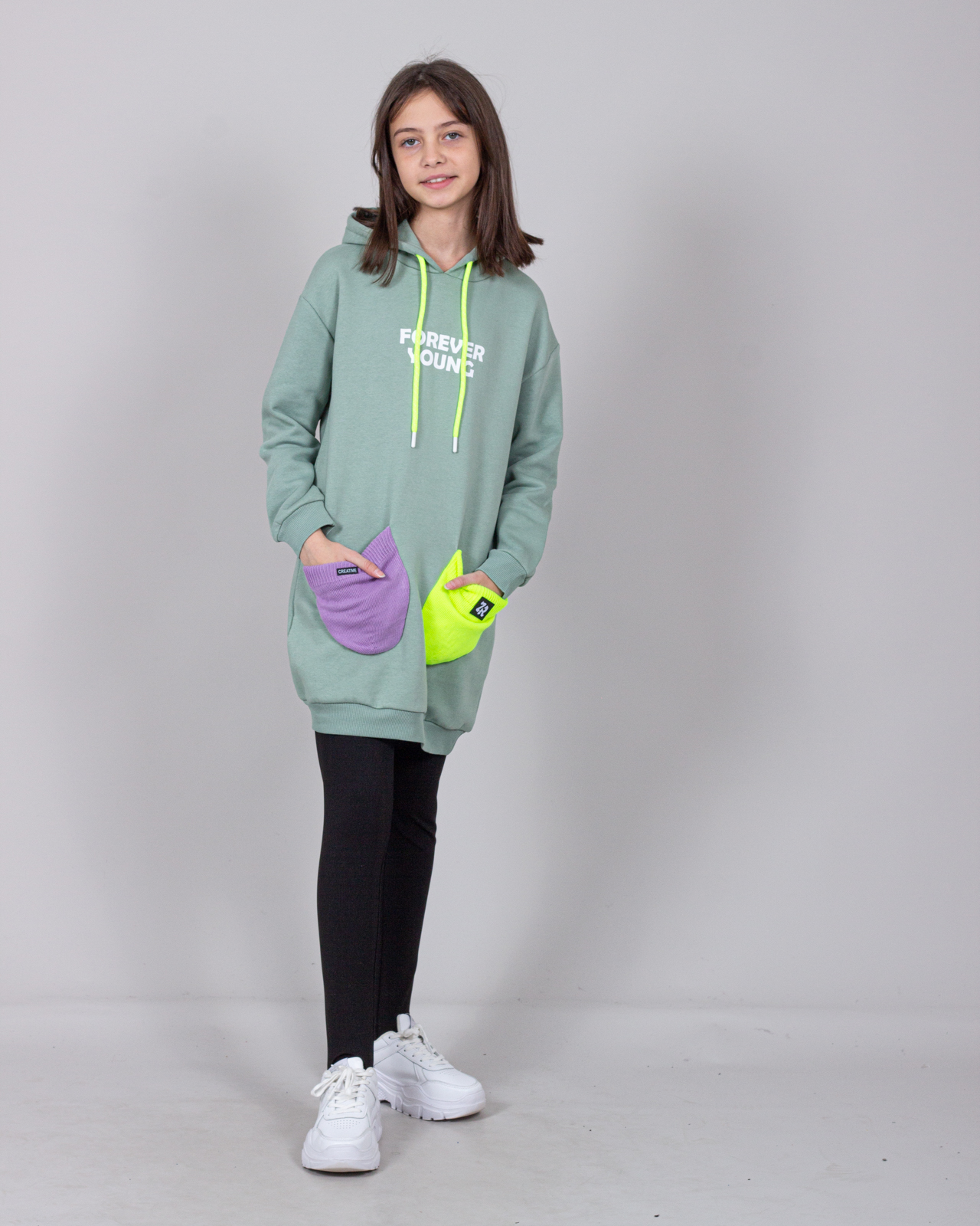 Худи для девочки выполнено из трикотажа - футер (начес). Модель дополнена двумя яркими накладными кармана.