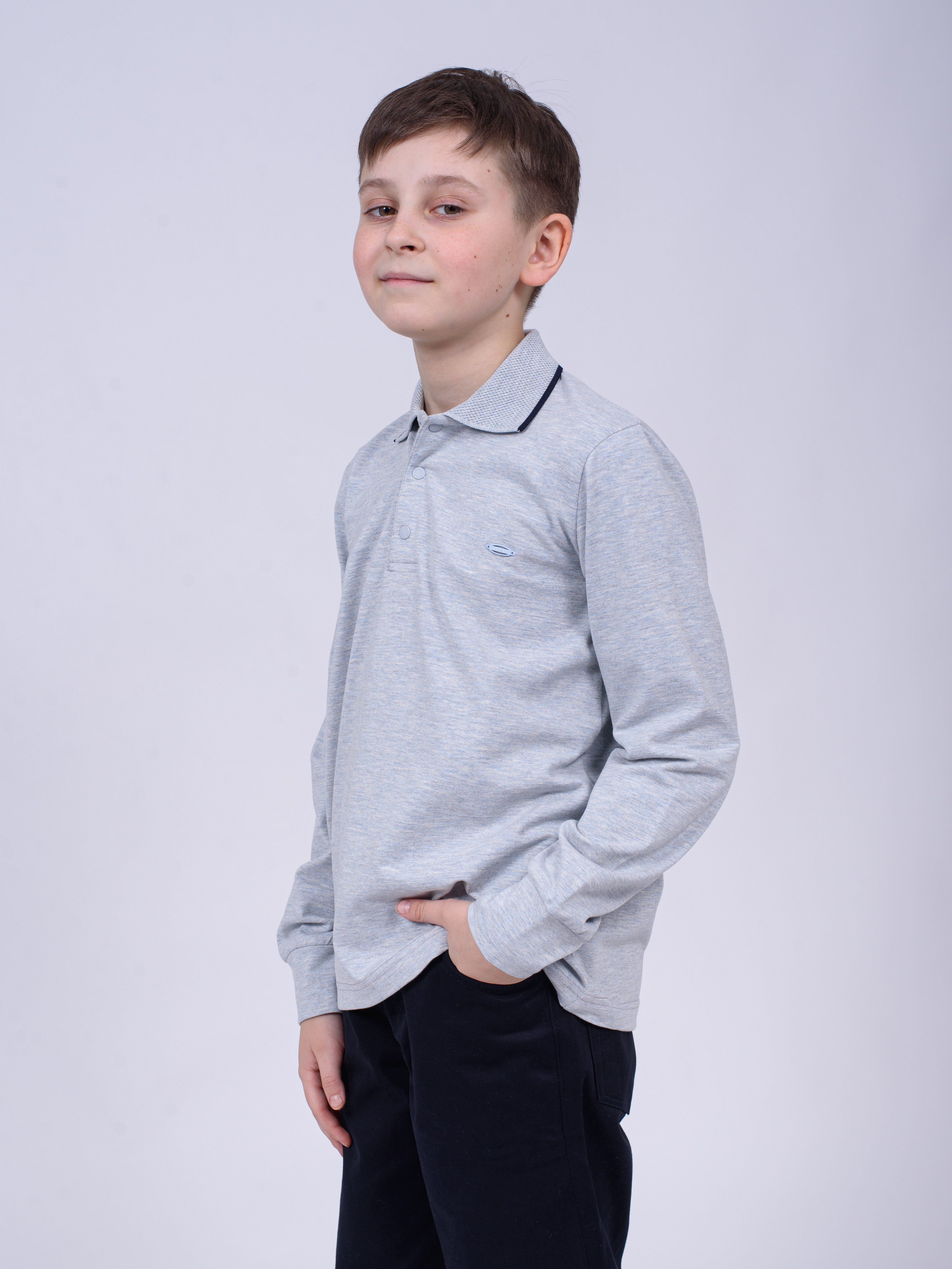 Детское однотонное поло Cegisa для мальчика оптом. Поло прямого силуэта имеет застежку- кнопки, вязаный отложной воротничок, рукава оформлены манжетами.