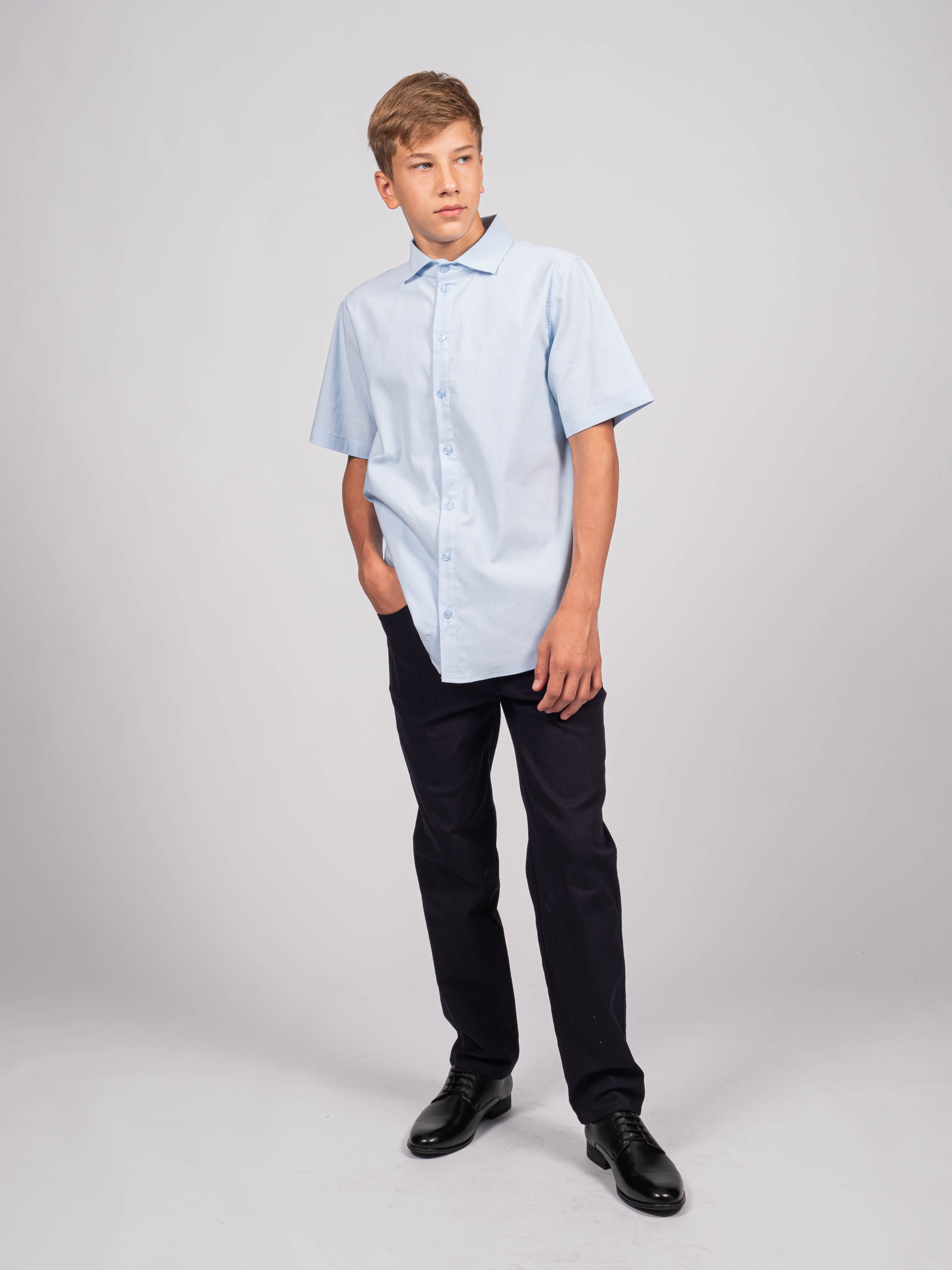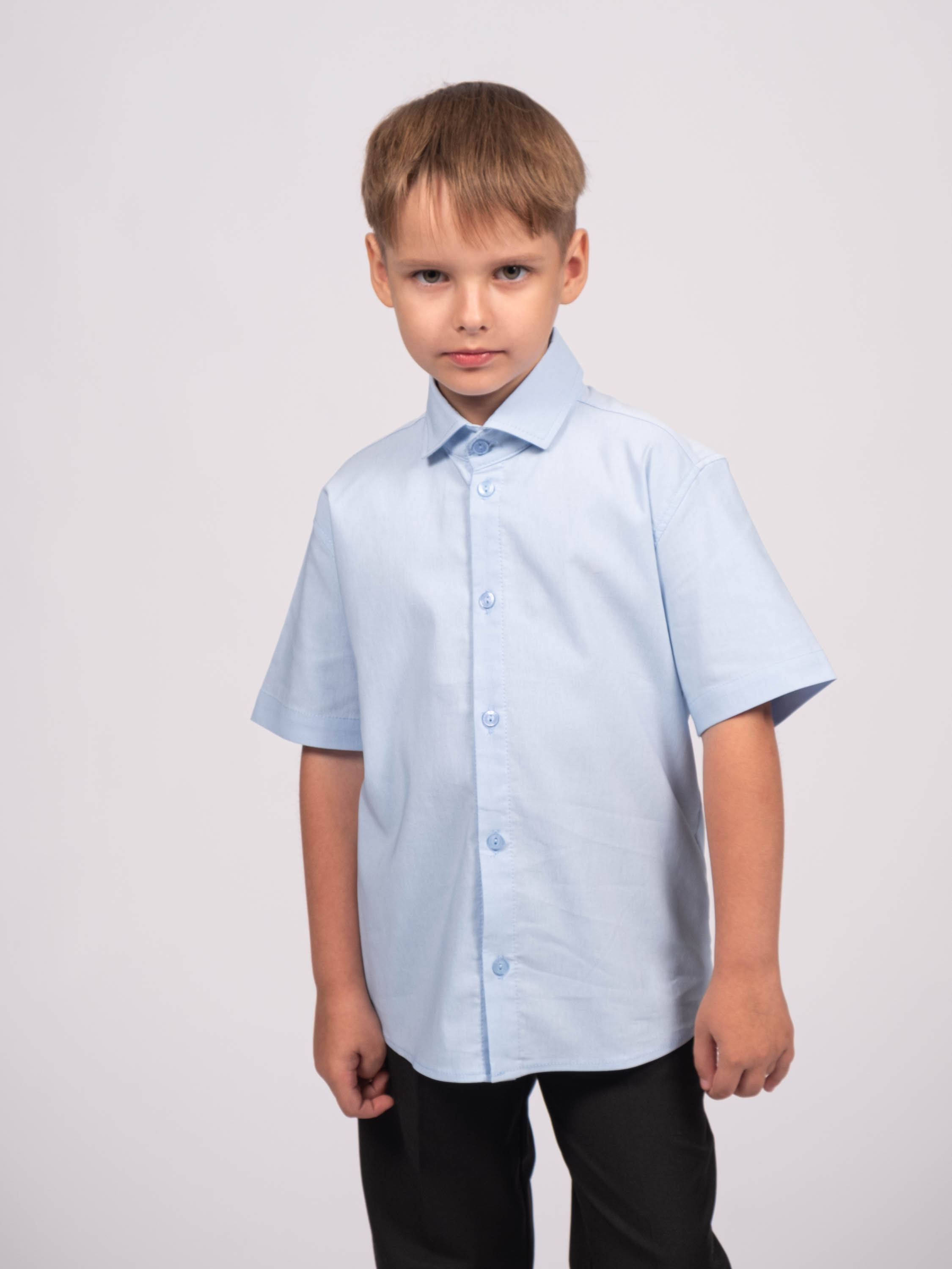 Детская однотонная рубашка для мальчиков оптом. Рубашка изготавлена из смесового материала высокого качества. Модель застегивается на пуговицы.