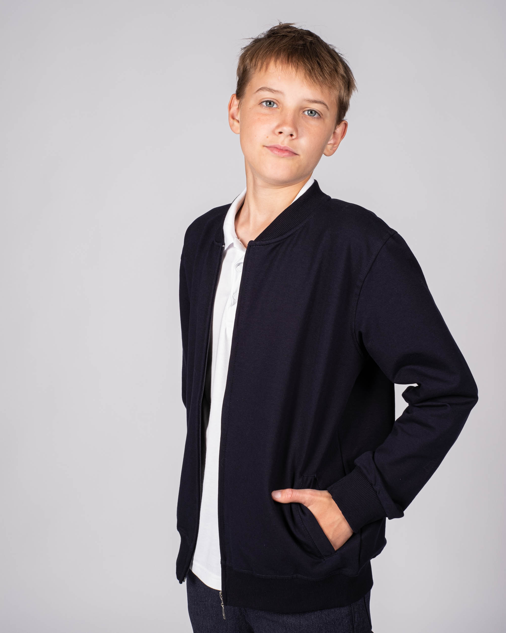 Трикотажный бомбер Cegisa для мальчика оптом. Выполнен из смесовой ткани, в составе которой натуральный хлопок с добавлением полиэстера. Воротник стойка. Низ изделия и рукава на трикотажном манжете. Вместительные карманы и разъемная застежка - молния. Хорошо сохраняет цвет и форму при длительной носке и после многократных стирок. Прекрасно будет смотреться как школьная форма.