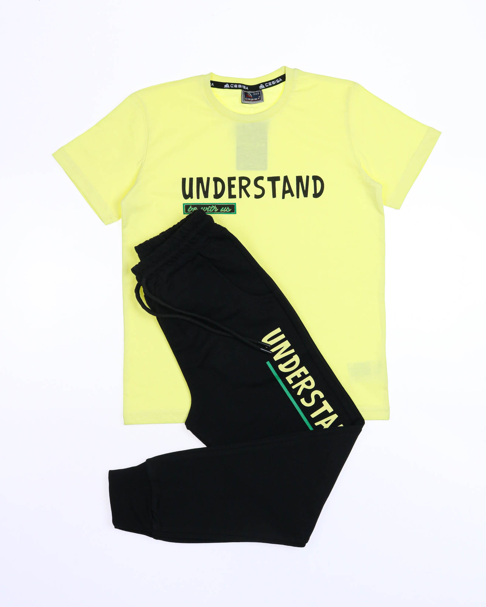 Трикотажный костюм CEGISA из хлопка оптом. Брюки выполнены из футера 2х нитки (петля) с карманами, на эластичном поясе с регулируемым шнурком и оригинальным принтом. Футболка выполнена из кулирной глади, прямого кроя с округлой горловиной.