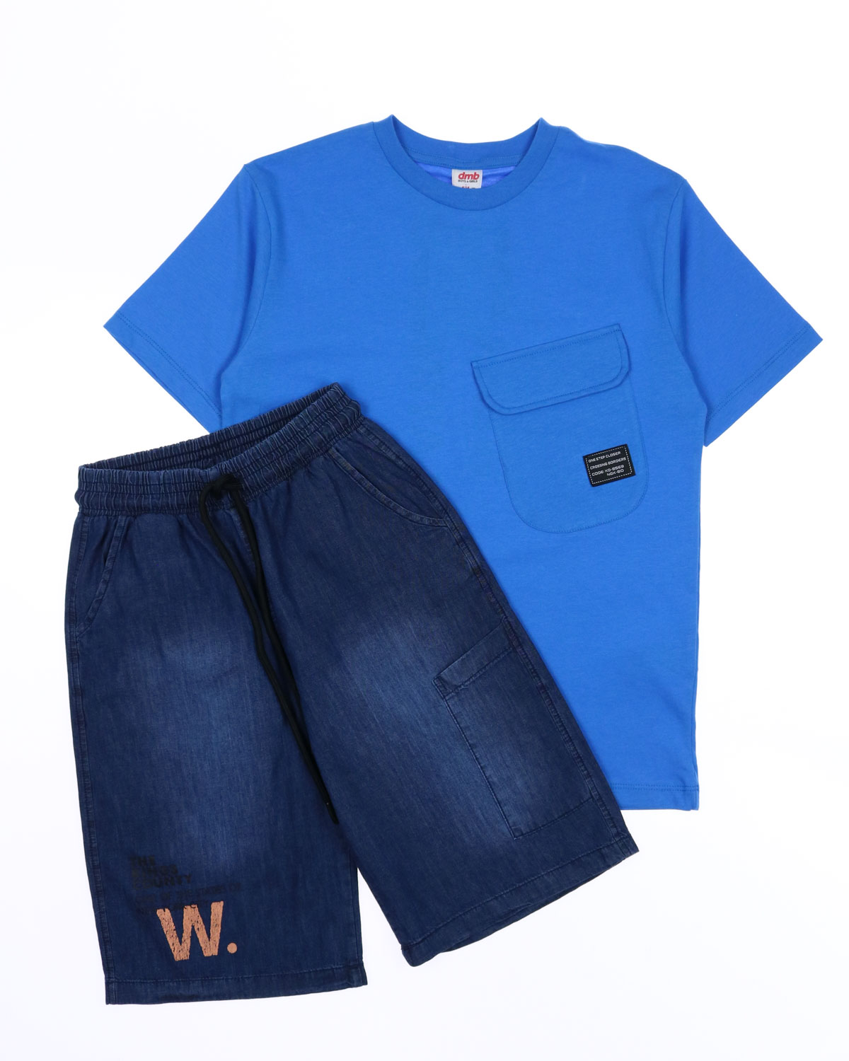 Костюм для мальчика DMB оптом. Футболка прямого кроя с короткими рукавами, на груди накладной карман. Бриджи из облегченной джинсы без эластана с боковыми карманами. Пояс на резинке с функциональным шнурком позволяет ругулировать объем на талии.