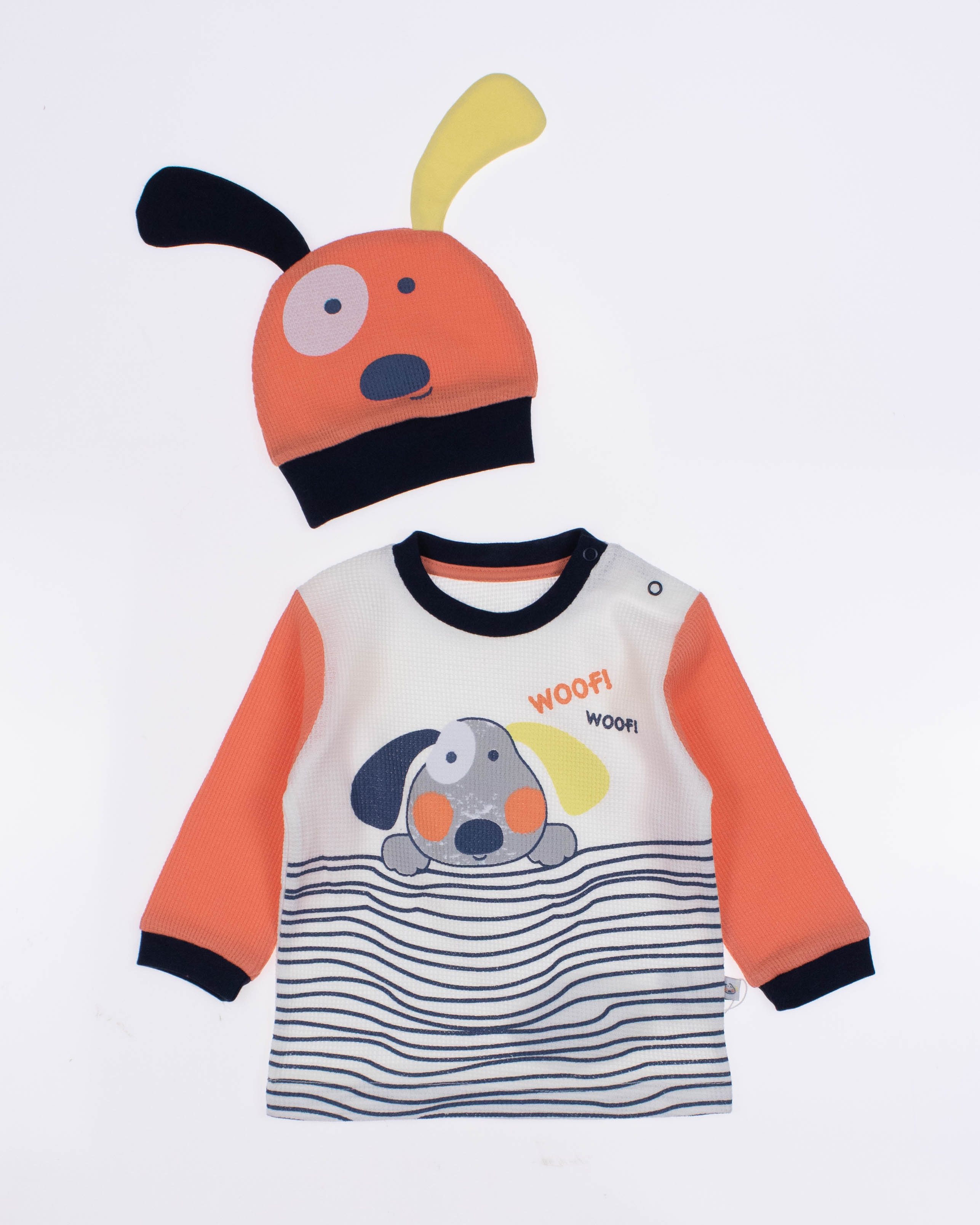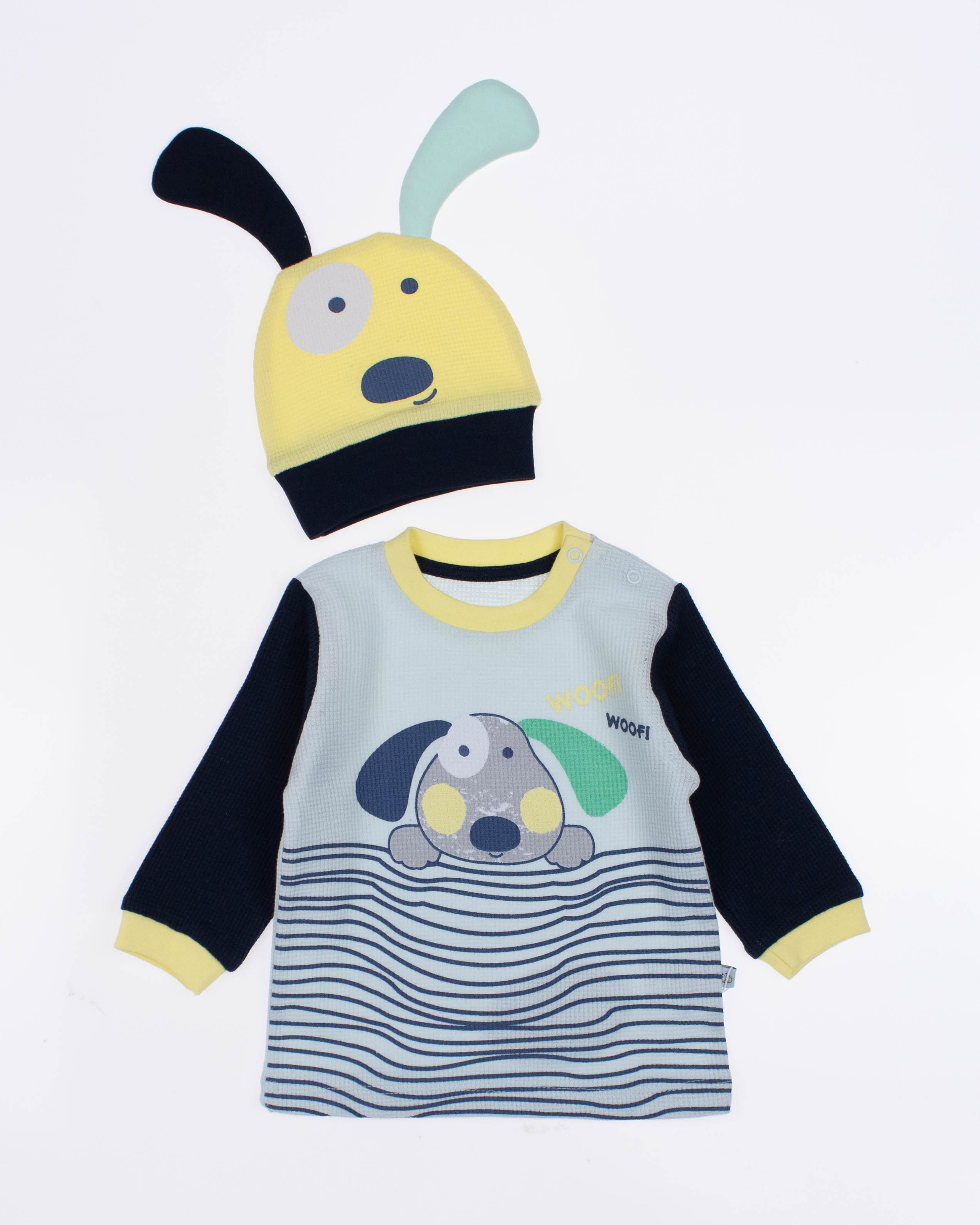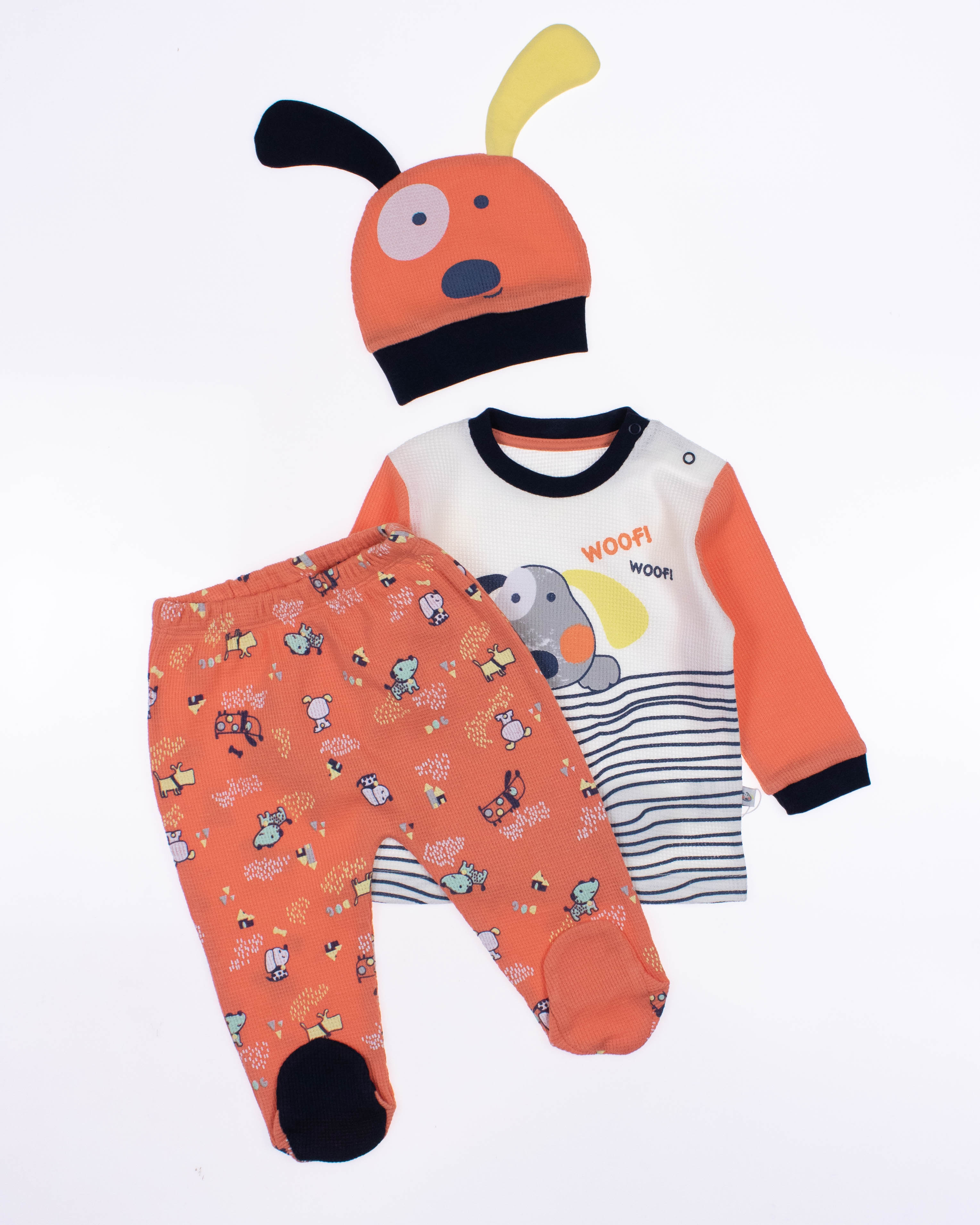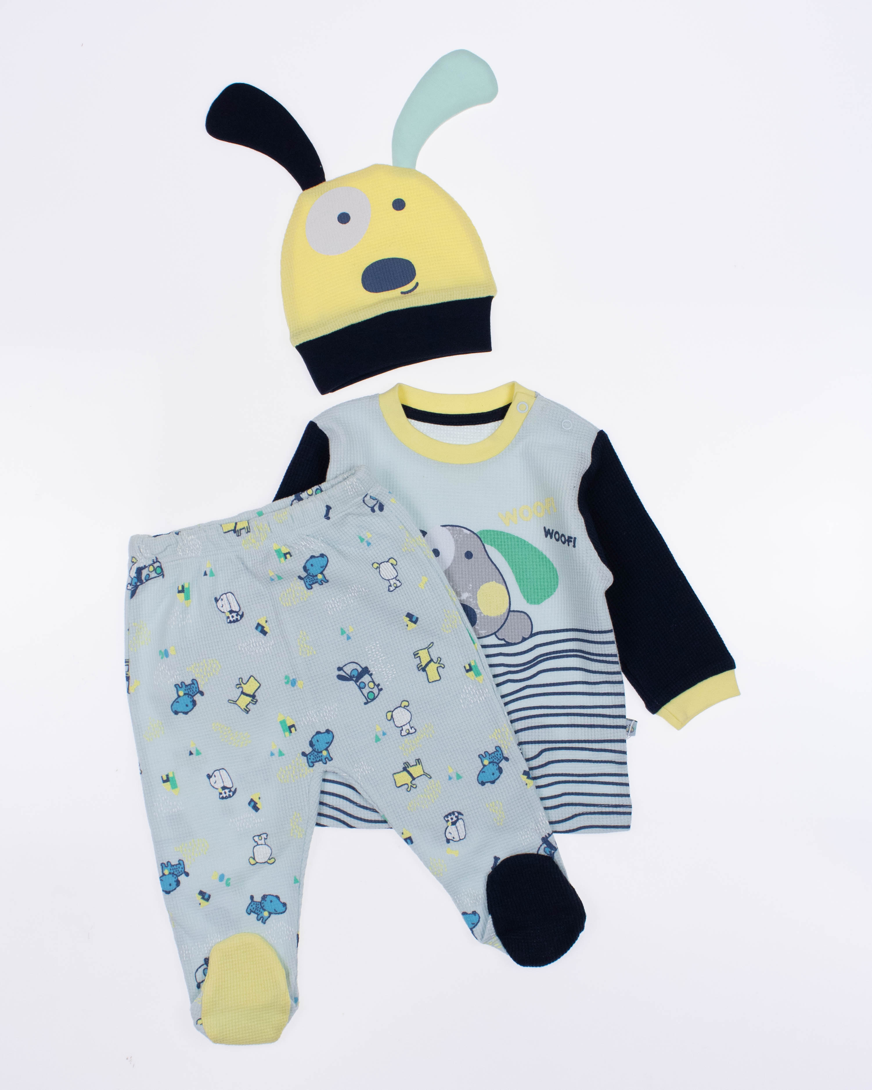 Функциональный, удобный и симпатичный комплект MYMIO BABY из  100% хлопка. Он включает в себя пять предметов: это кофточка с длинным рукавом, ползунки и  шапочка. Каждую деталь можно надевать отдельно или комбинировать с другими вещами.