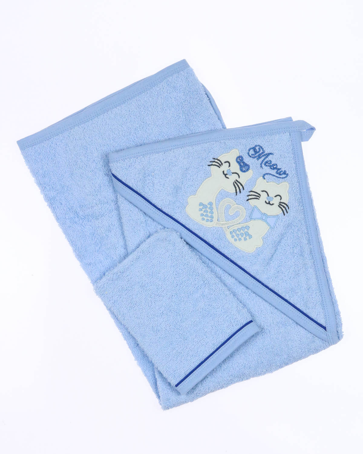 Полотенце с капюшоном и рукавица,  позволяет вытирать ребенка после купания так, чтобы его головка всегда оставалась в тепле. Благодаря петельке -   детское полотенце с капюшоном легко повесить сушиться, а варежкой можно вытереть ребёнка после кормления, а также утром после крепкого сна.  Детское полотенце из махровой ткани приятное на ощупь, отлично впитывает влагу и быстро сохнет. Капюшон декорирован милейшей аппликацией и вышивкой. Края детского полотенца обработаны хлопковой трикотажной окантовкой.