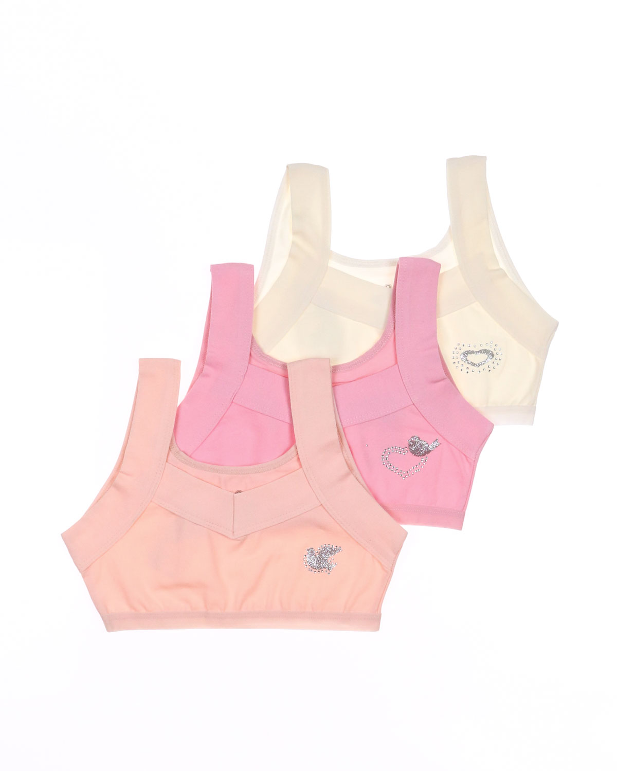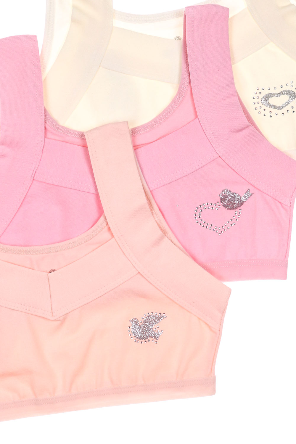 Бюстье для девочки изготовлено из кулирки гладкого, приятного к телу материала. Хорошо тянется благодаря добавлению эластана.   Бюстье для девочки очень комфортно для повседневной носки. Гипоаллергенная ткань приятно прилегает к телу, впитывая излишки влаги, пропуская воздух. Современная технология пошива обеспечивает изделиям высокие качественные характеристики и идеальный комфорт. Очаровательный дизайн и милый блестящий принт смотрятся невероятно нежно.